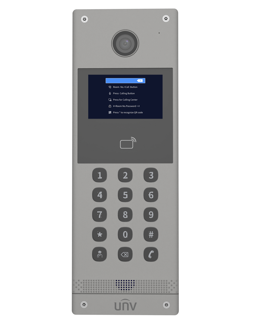 CMOS 2Мп цветный объектив, DWDR; Web интерфейс; Хранилище: 10,000 карт, Встроенный микрофон и динамик, PoE, 1 RS485 интерфейс, 1 Wiegand, 2 реле, тревожные вх./вых. 4/2, IP65, IK08, -40°C ~ 60°C, Металл, Поддержка приложения UNV-Link