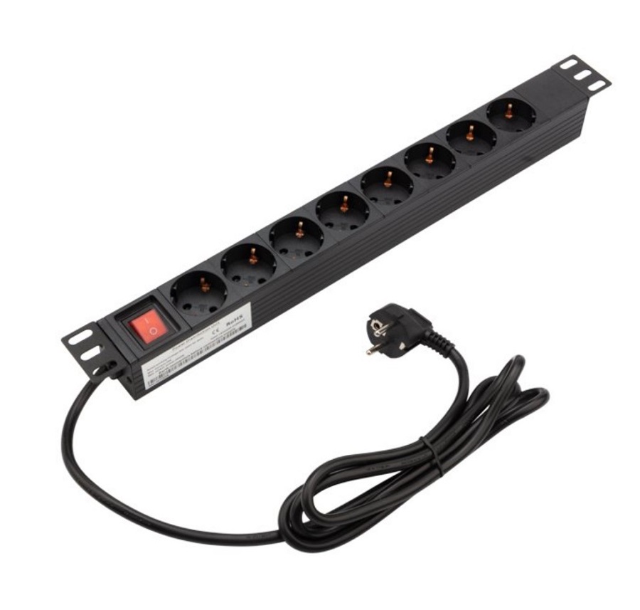 Блок розеток 19", 1U, 8 EURO розеток, U-ном.220 В, I-max.10 А, корпус алюминий, со шнуром питания 1.8 м.