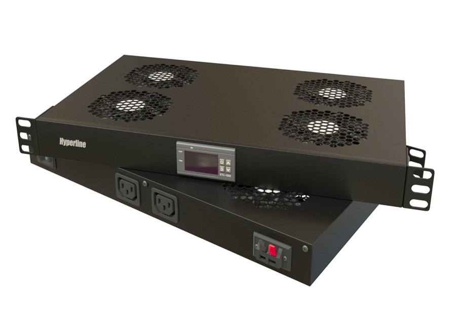 Hyperline TRFA-WB-MICR-4F-RAL9004 Модуль вентиляторный 19", 1U, глубиной 290мм, с термостатом и 4-я вентиляторами, номинальная мощность 70.40 Вт, датчик температуры с кабелем, кабель питания C13-Schuko 1.8м, цвет черный (RAL 9004).