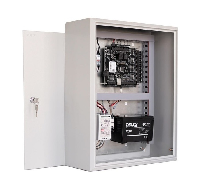 Контроллер СКУД в металлическом корпусе с установленным блоком питания. Поддержка управления до 4 точек доступа. Интерфейс связи Ethernet, поддержка SNMP и SSL/TLS-шифрования данных.