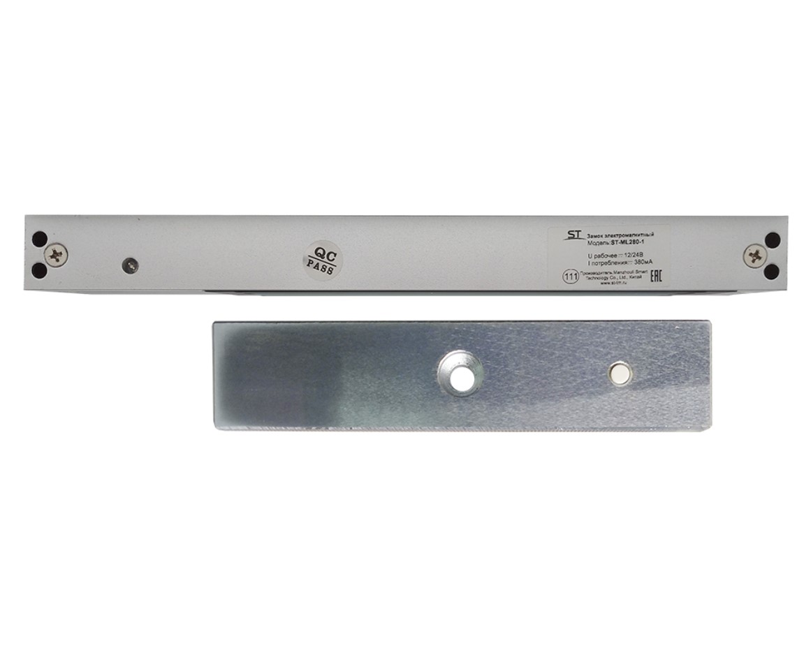 Замок электромагнитный ST-ML280-1, Предназначен для запирания дверей, ворот, калиток с возможностью дистанционного открывания,в том числе для работы совместно с аудио и видеодомофонами, контроллерами СКУД и кодовыми панелями, Рабочее напряжение: 12-14В, Ток потребления: 380мА, Сила удержания: 280кг, –40..+50°C, 250*25*41 мм.