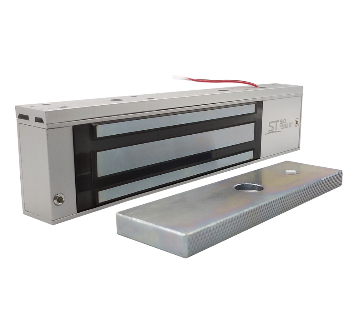Замок электромагнитный ST-ML350-1 с ST-ZLA350-1, ST-ML350-1 предназначен для запирания дверей, ворот, калиток с возможностью дистанционного открывания,в том числе для работы совместно с аудио и видеодомофонами, контроллерами СКУД и кодовыми панелями, ST-ZLA350-1 -ZL-образное крепление для электромагнитных замков предназначено для крепления электромагнитных замков на двери, открывающиеся внутрь,для электромагнитных замков с силой удержания 350 кг.Материал креплений – алюминий, Рабочее напряжение: 12-14В, Ток потребления: 460мА, Сила удержания: 350кг, –40..+50°C, 250*27*50 мм.