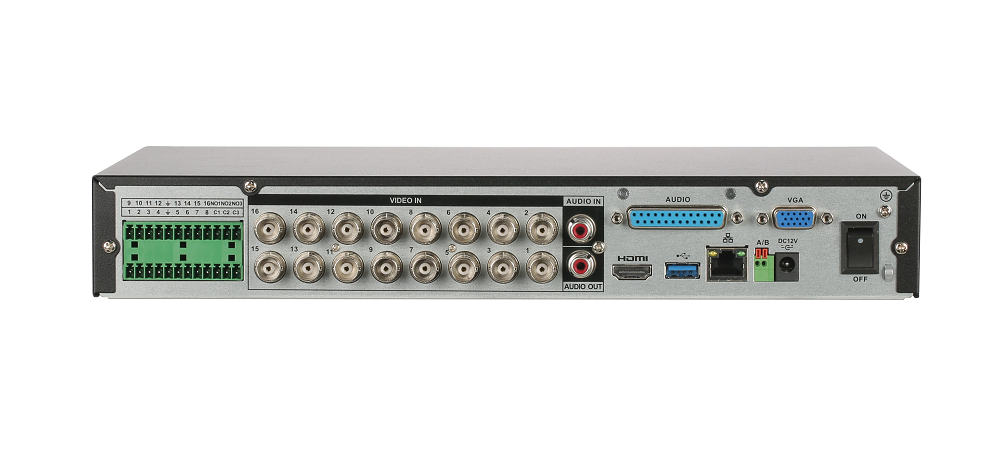 Формат видеосигнала: HDCVI, AHD, TVI, IP, CVBS; отображение: до 5Мп; запись: 4кн до 5M-N@25к/с, остальные 5M-N@12к/с; кодирование: AI/H.265+, H.265, H.264+, H.264; IP-каналы: до 24 каналов, до 6Мп; накопители: 1 SATA III до 16Тбайт; видеоаналитика: 2кн AcuPick, 2кн распознавание лиц, 4кн охрана периметра, 16кн интеллектуальный детектор движения SMD Plus, IVS, интеллектуальный поиск; видеовыходы: 1 HDMI, 1 VGA; сеть: 1 RJ45 1000Мбит/с;  аудиовх/вых: 16/1, двунаправленная аудиосвязь: 16 HDCVI-каналов; тревожные вх/вых: 16/3; питание: 12В(DC).