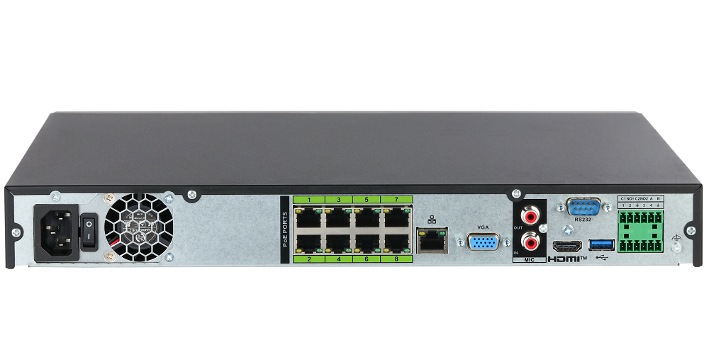 Входящий поток до 448Мбит/с; сжатие: H.265+, H.265, H.264+, H.264, MJPEG; разрешение записи до 32Мп; накопители: 2 SATA III до 20Тбайт; воспроизведение: 16кн@5Mp, 2кн@32Мп; видеовыходы: 1 HDMI (8K), 1 VGA; cеть: 1 RJ45 1000Мбит/с, 8 RJ45 100Мбит/с (PoE/PoE+, до 130Вт, поддержка ePoE); aудиовх/вых: 1/1; тревожные вх./вых.: 4/2; питание: 100~240В(AC);