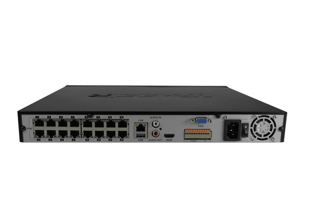 TRASSIR MiniNVR 2216R-16P — Сетевой видеорегистратор для IP-видеокамер (любого поддерживаемого производителя) под управлением TRASSIR на базе ОС Linux c 16-ю портами PoE. Регистрация и воспроизведение до 16 IP видеокамер (список протестированного оборудования на сайте http://dssl.ru/, суммарный поток до 256 Мбит/сек), лицензии на подключение видеокамер в комплекте. Разрешение записи до 12 MП. Вывод видео с разрешением до 4K. Поддержка кодеков H.264 / H.265. Без HDD в комплекте. Установка до 2-х HDD/SSD 3.5" объёмом до 8 ТБ каждый. Сетевой интерфейс 1 RJ-45 10M/100M/1000M Ethernet. 1 x HDMI, 1 x VGA выходы (независимые). 1 x USB 2.0, 1 x USB 3.0. Бесплатный сетевой клиент (в т.ч. мобильные приложения). Габариты 380х330х45 мм.